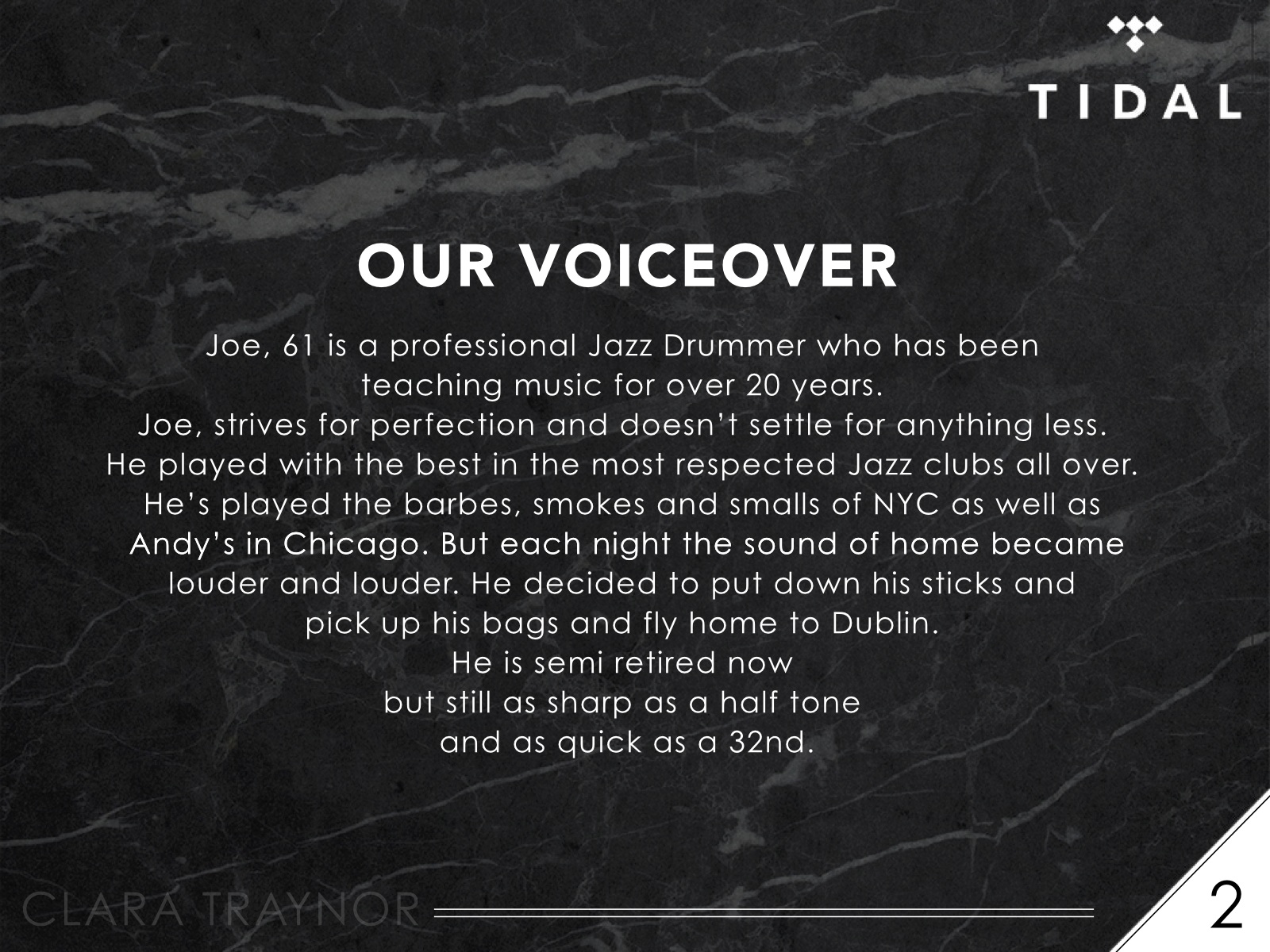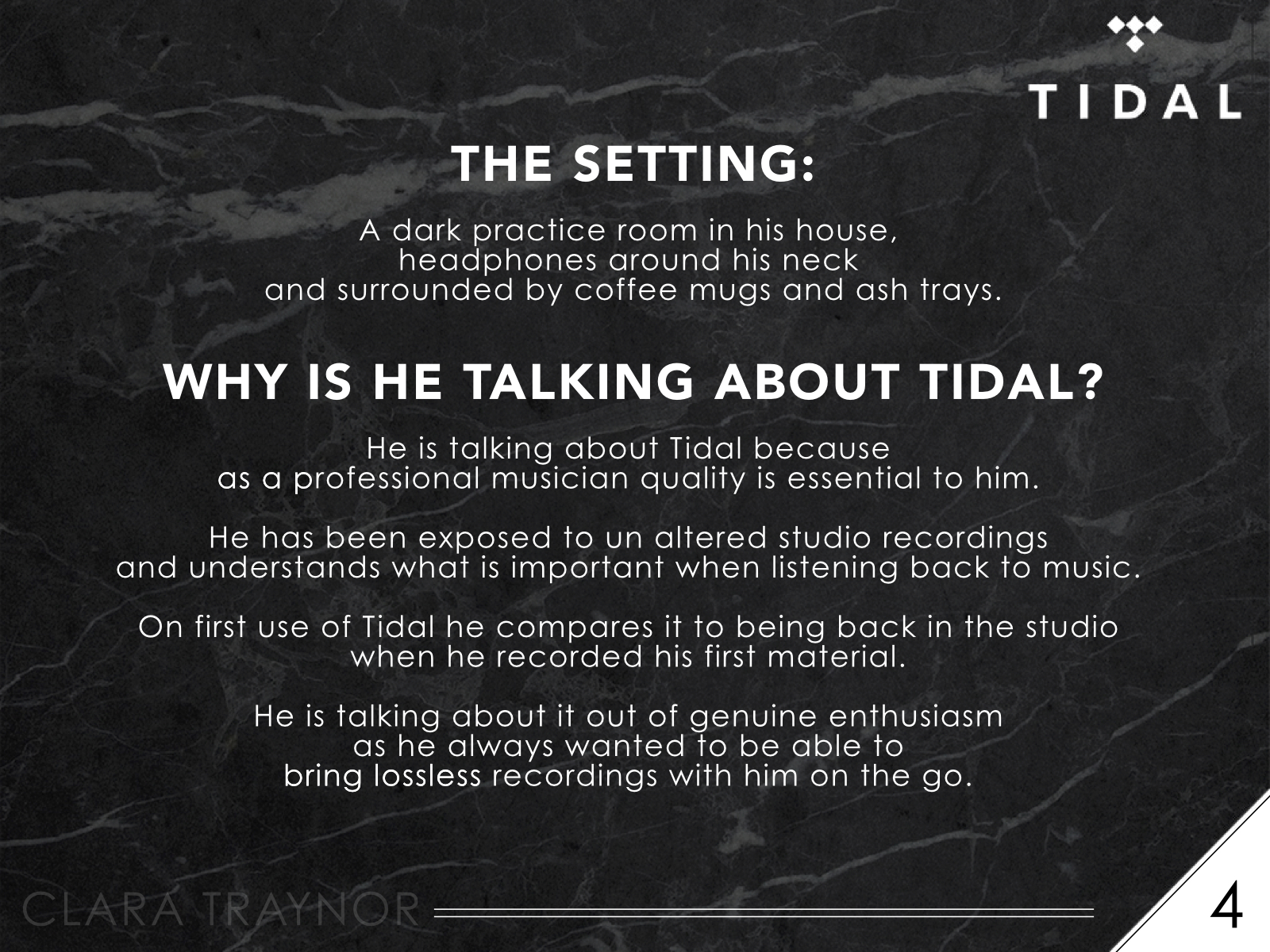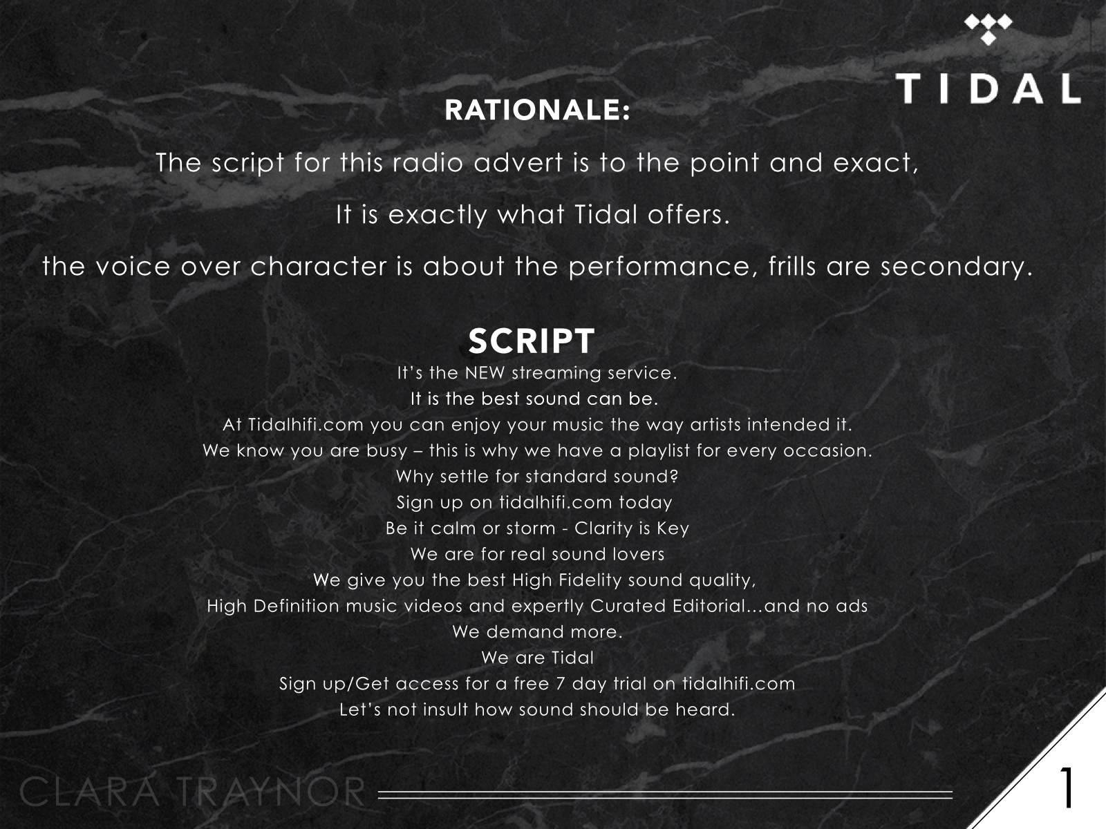 Tidal HiFi Radio Advertisement. Tidal College Brief as part of my radio production module. Voice Actor: Morgan Jones Note: This brief was given before the Jay Z announcement so a different route might have been considered. LISTEN TO THE AUDIO BELOW http://soundcloud.com/faith-cat/tidal-hifi-radio-advertisement Share this: Click to share on X (Opens in new window) X Click to share on Facebook (Opens in new window) Facebook Like Loading... Related